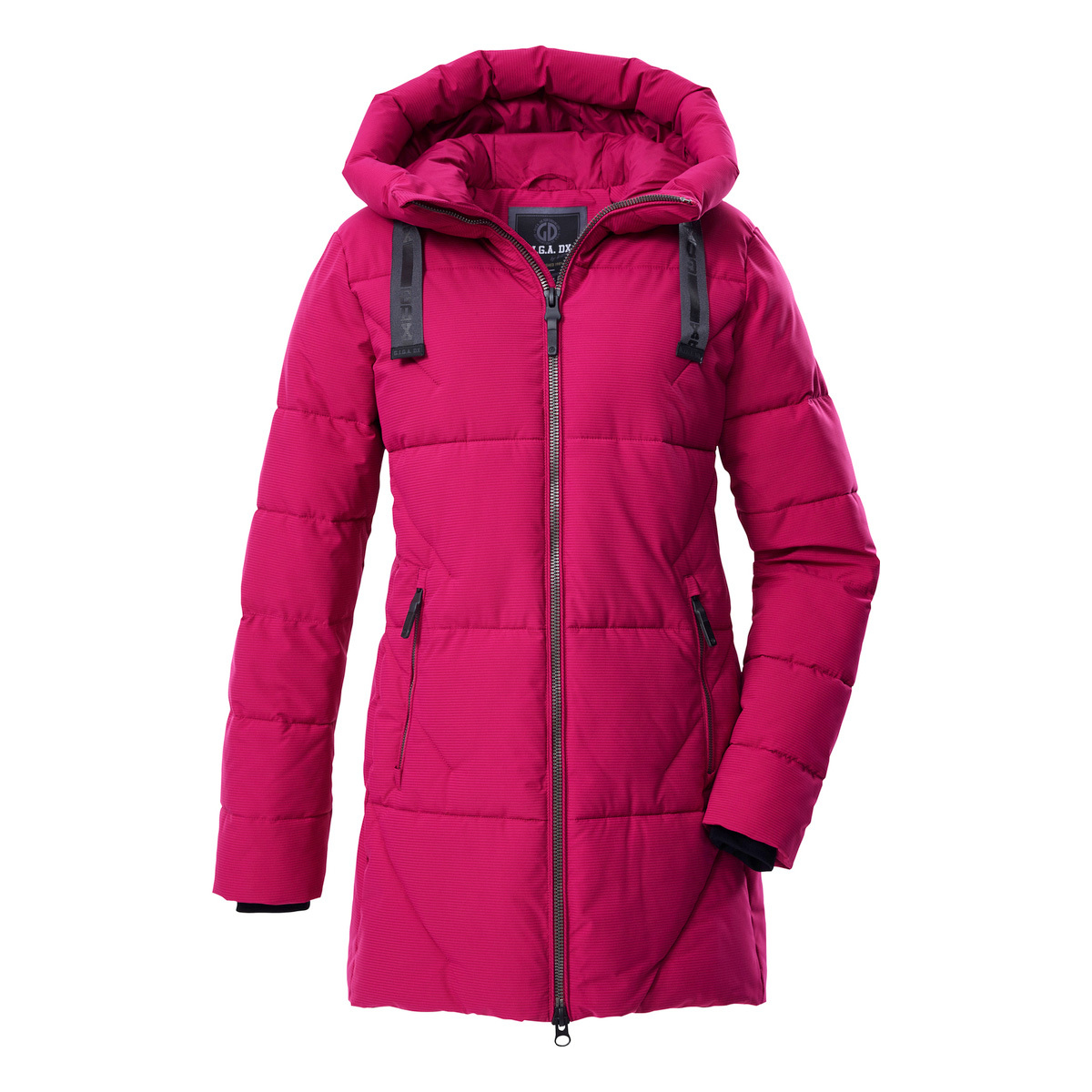 Silně podšitá prošívaná parka s velkou kapucí od GIGA DX kombinuje funkčnost s ležérním vzhledem. Je vybavena vodoodpudivou úpravou a ochranou proti větru s hydrostatickým sloupcem 10 000 mm, takže zajišťuje pohodlí za každého počasí. Zároveň prodyšnost s propustností vodní páry 3 000 g/m²/24h nabízí dodatečný komfort. Pletené manžety na rukávech jsou hřejivé a pohodlné. Dvoucestný zip a boční zipy zajišťují volnost pohybu. Dvě velké kapsy na zip a vnitřní kapsa nabízejí dostatek prostoru pro vaše nezbytnosti. Tato parka neobsahuje PFAS a obsahuje recyklovaný materiál.